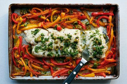 ماهی کبابی در سینی فر با فلفل دلمهای شیرین