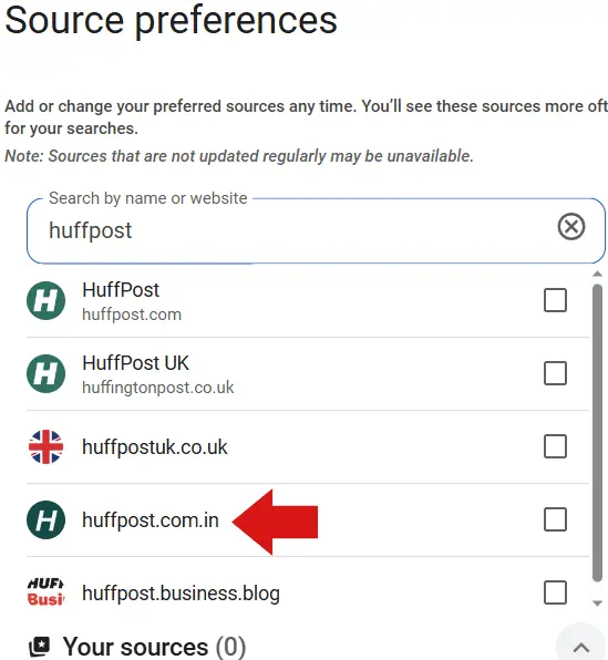 برای مثال، جستجو در ابزار منابع ترجیحی برای Huffpost، یک سایت تقلبی روی دامنه کشوری هندی را ظاهر میکند.