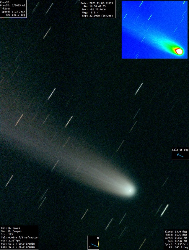 در مقایسه، در زیر تصویری از شهابسنگ سامانهٔ خورشیدی به نام Lemmon قرار میدهم که توسط یکی از تلسکوپهایی که دو روز پیش 3I/ATLAS را مشاهده کردهاند، گرفته شده است. Lemmon دارای دم شهابمانند واضحی است که به سمت مخالف خورشید کشیده شده است، همانطور که انتظار میرفت.