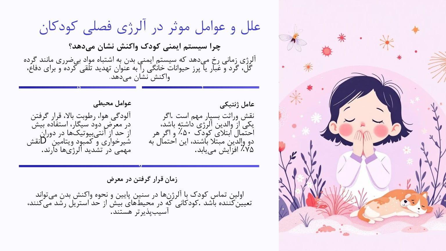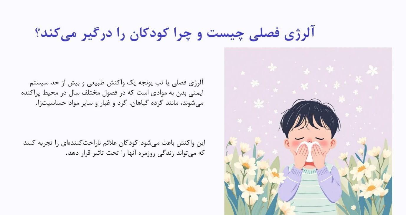 آلرژی‌ فصلی در کودکان یکی از مشکلات رایج در فصل‌های بهار، تابستان و حتی پاییز است و بسیاری از والدین با دیدن عطسه‌های پشت‌سرهم، خارش چشم، آبریزش بینی یا بی‌حوصلگی فرزندشان نگران می‌شوند. بعضی والدین فکر می‌کنند کودک سرما خورده، اما ادامه‌دار بودن علائم نشان می‌دهد موضوع چیز دیگری است. شناخت درست این بیماری و یادگیری راه‌های کنترل آن می‌تواند کمک کند تا کودک راحت‌تر نفس بکشد، بهتر بخوابد و در مدرسه هم تمرکز بیشتری داشته باشد. هدف این مقاله این است که با زبانی ساده و قابل فهم، همه چیز را درباره آلرژی‌ فصلی در کودکان توضیح دهد تا والدین بتوانند با خیال راحت شرایط را مدیریت کنند.
