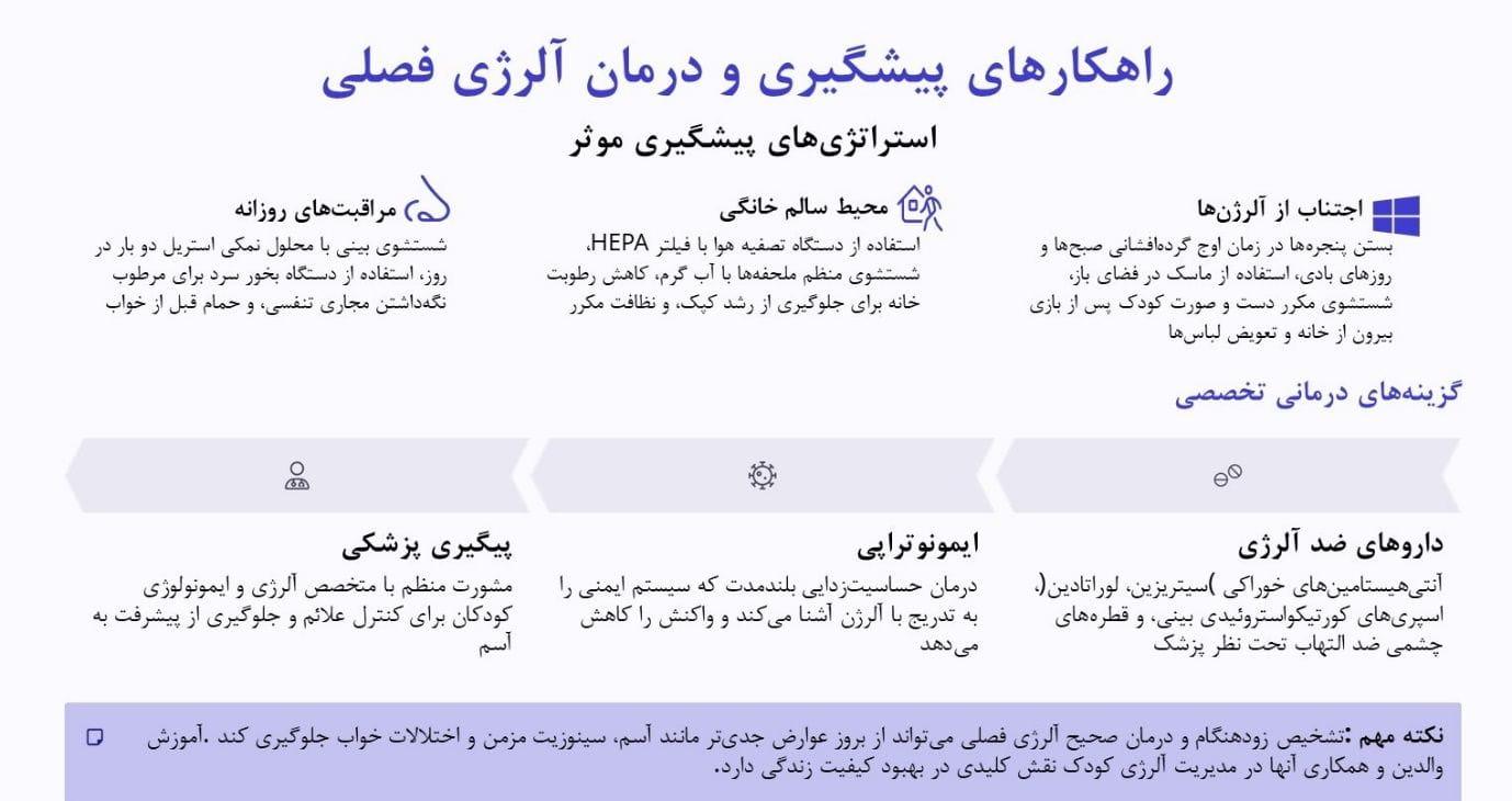 درمان آلرژی‌ فصلی در کودکان بسته به شدت علائم، سن کودک و شرایط محیطی انتخاب می‌شود. نکته مهم این است که هیچ دارویی نباید خودسرانه مصرف شود و حتماً باید با مشورت پزشک باشد.